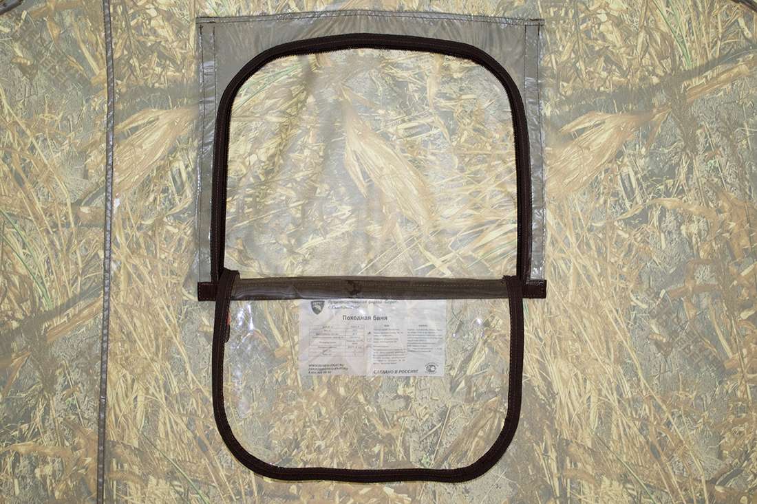 Съемная распашная дверь, которой комплектуется походная баня, делает доступным вход в палатку без использования молний, что сокращает потери тепла. Дверь состоит из тента и каркаса, устанавливается на липу и компактно складывается.