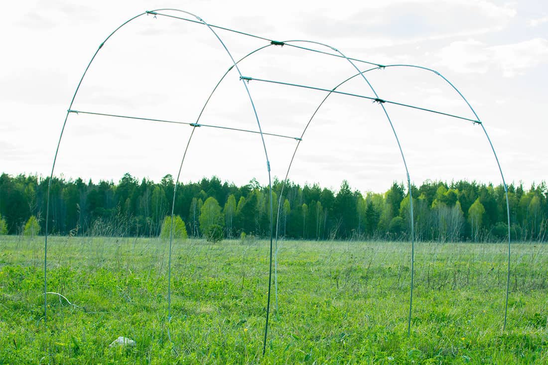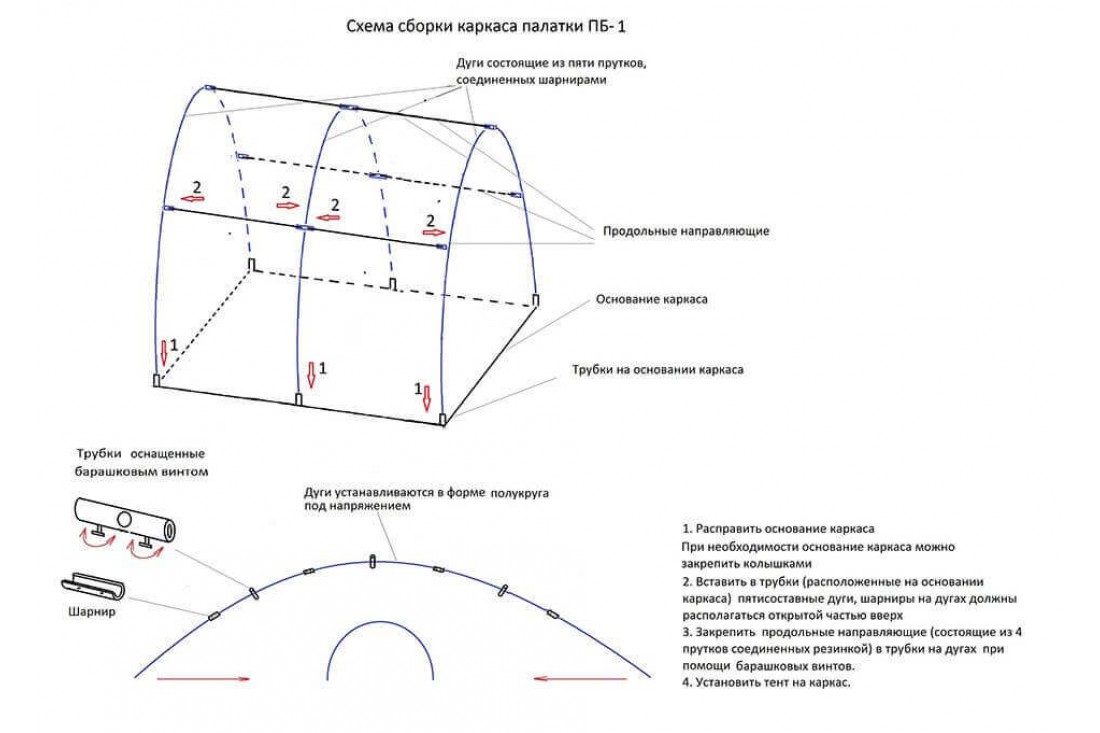 В трубки, расположенные в основании каркаса, вставьте складные дуги. Шарниры на дугах устанавливаются открытой частью вверх;