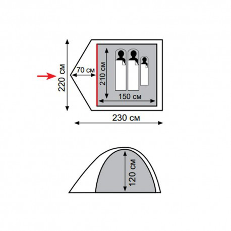 Палатка имеет 1 тамбур, 2 вентиляционных клапана, вход во внутреннюю палатку продублирован москитной сеткой.