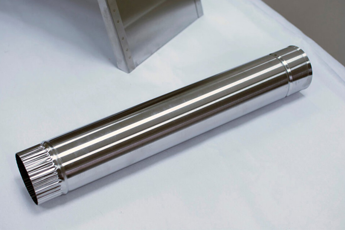 Секция трубы для печей "Берег". Изготовлены трубы из жаростойкой нержавеющей стали Aisi 430 толщиной 0,5 мм. Данная марка стали устойчива к коррозии и окислению.