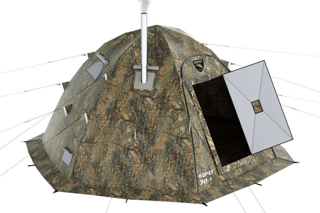 Универсальная палатка УП-1 Берег - однослойная быстросборная шестиместная палатка шатрового типа на восьмилучевом каркасе.