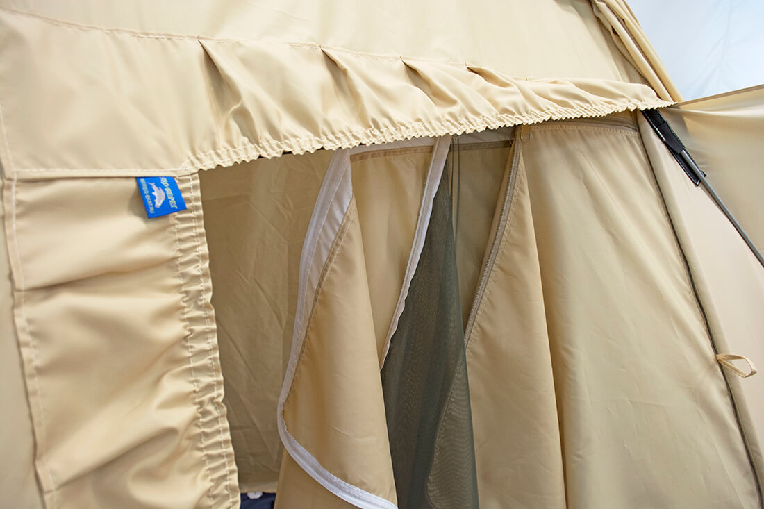 В комплектацию УП-7 входят многофункциональные окна, состоящие из: защитного клапана на внешнем тенте, оконного заполнения из морозостойкой силиконовой пленки (выдерживает до – 50 °С), внешнего тента, москитной сетки и внутреннего тента.
