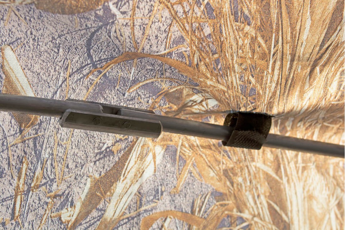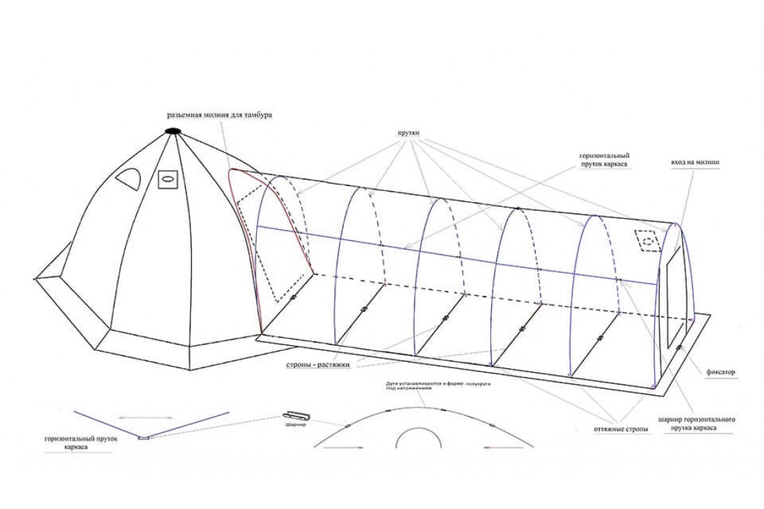 Соединяется тамбур-баня с палатками серии УП с помощью молнии, которая находится на специальном козырьке тамбура и над входом палаток.