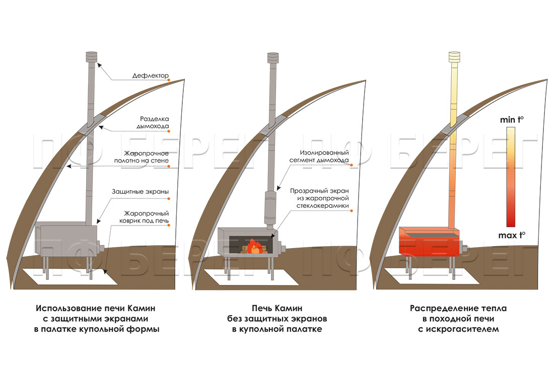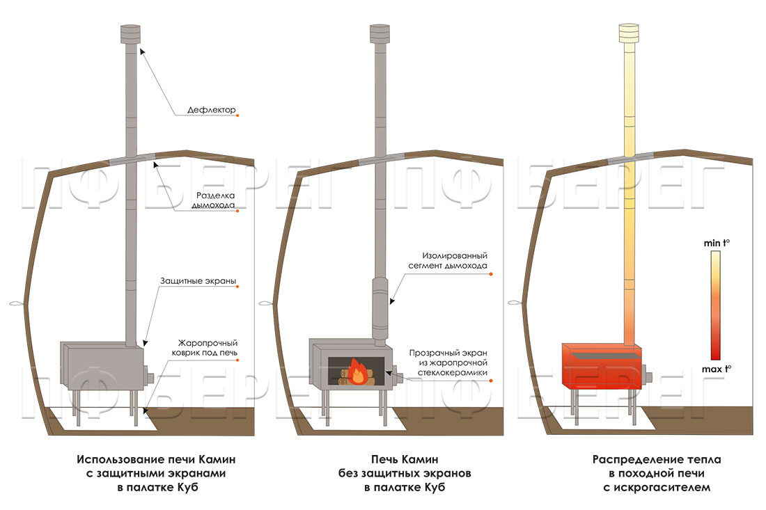 Походные печи для палатки Камин комплектуются 4 металлическими защитными экранами. Экраны походных печей защищают пользователя от соприкосновения с горячей поверхностью топки. В нижней и торцевой частях находятся 2 стационарных экрана. 2 съемных экрана расположены по бокам. Каждый отражающий экран имеет дополнительное назначение: нижний экран предотвращает таяние льда и снега под печью, торцевой — снижает воздействие температуры на стенку за печью, а съемные боковые — защищают стеклокерамические вставки при перевозке и хранении печи.