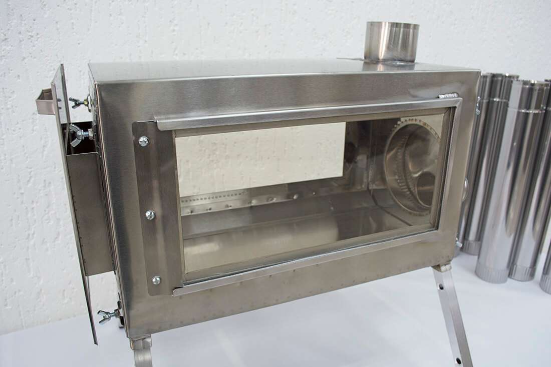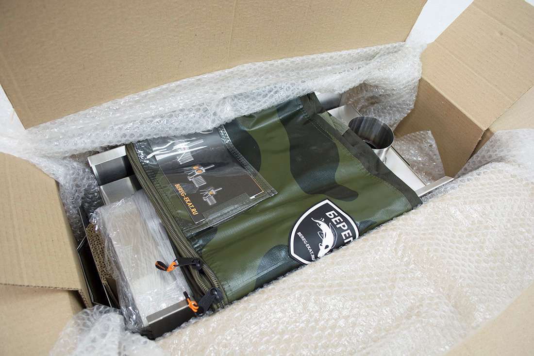 Печь походная туристическая Берег Камин Средняя изготовлена из комбинированных материалов. Корпус печи выполнен из нержавеющей стали AISI 430 толщиной 1 мм. Термостойкие стекла для прозрачных боковых вставок толщиной 4 мм производятся в Германии. Место соединения металлической и стеклокерамической частей снабжено термостойким уплотнителем. Уплотнитель исключает утечки дыма или повреждение стекла при эксплуатации. Герметичность печи обеспечена дополнительной проваркой аргоном.