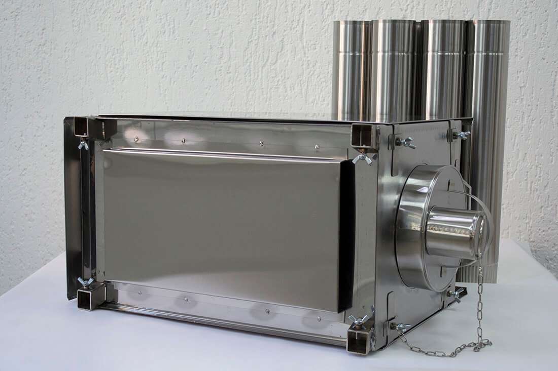 В нижней части топочной камеры находятся две пластины из нержавеющей стали. Пластины приварены вдоль боковых стенок под углом 45 градусов и выполняют роль дополнительных ребер жесткости. Также, пластины способствуют смещению дров к центру топочной камеры для полного сгорания.