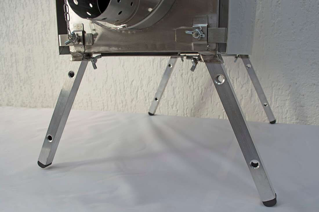 Положение боковых защитных экранов может регулироваться ниже или выше уровня варочной поверхности походной печи.