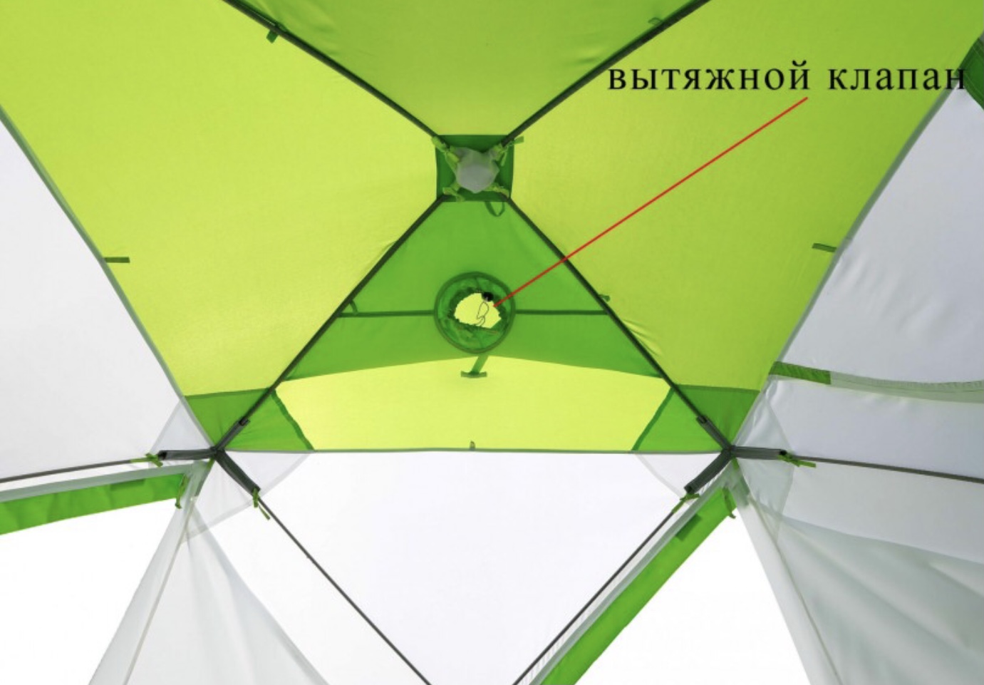 Палатка крепится к гидроизоляционному дну (опция, приобретается отдельно) при помощи петель, которые расположены под внешней юбкой, при этом сама юбка обеспечивает надежную защиту от попадания осадков внутрь «гидро-корыта».