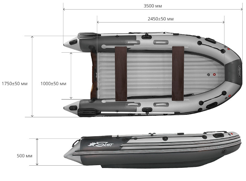 В отличии от стандартных моделей лодок с надувным днищем, модель Скат оснащена дном катамаранного типа, что придает большую устойчивость на воде и лучшую управляемость, значительно повышая скоростные характеристики. Данный вид днища также позволяет значительно сократить время на сборку/разборку лодки.