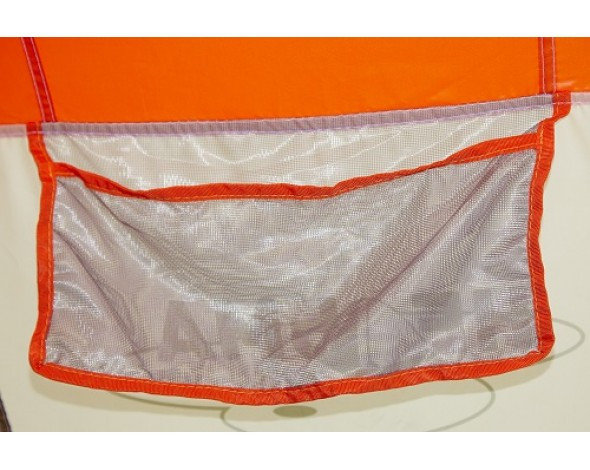 Характерный дизайн Митек: яркий оранжевый купол, непромокаемый тент со светлыми и темными вставками.