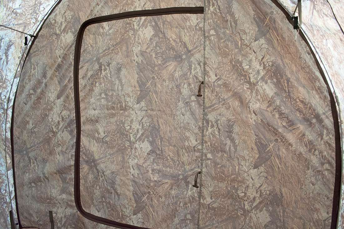 - Складной распашной дверью.Съемная дверь, делает возможным вход и выход без использований молний, что помогает сохранить тепло в палатке;